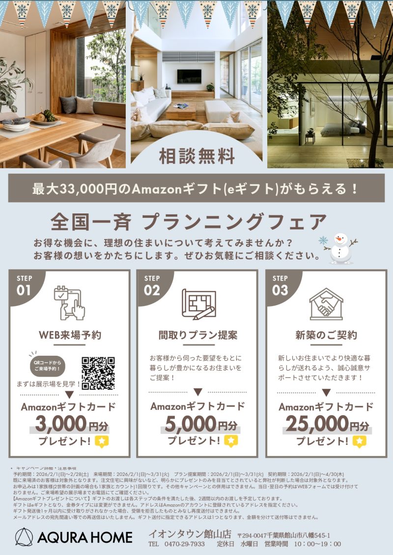 最大33,000円のAmazonギフトカードがもらえる!全国一斉 プランニングフェア|AQ Group アキュラホーム